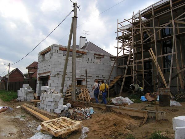 Это - один из наших самых интересных объектов. Задача архитектора и проектировщиков заключалась в том, чтобы дом, построенный по типовому проекту, обрел индивидуальность, скромную и интеллигентную, будучи при этом дополнен спутниками - на участке планировалось возведение еще нескольких строений.